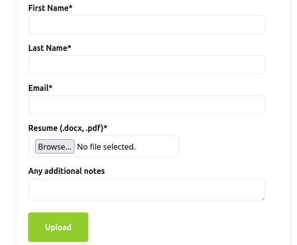 The first thing I noticed was the Resume file selector in the form. It says it only allows .docx and .pdf files are allowed, however it allowed me to upload a shell.php file, so there is no frontend or backend validation of the file type.