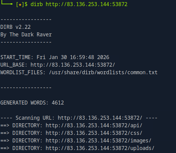 My next step was to try to find the upload directory for the resumes. I tried to visit /uploads/shell.php, however that didn't seem to work. I figured that it may be using a less obvious directory, so I ran dirb with the default wordlist. This gave me 4 directories:
