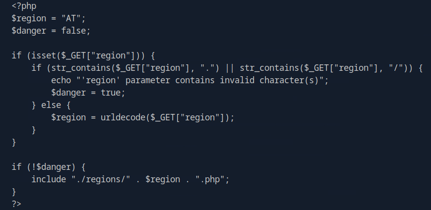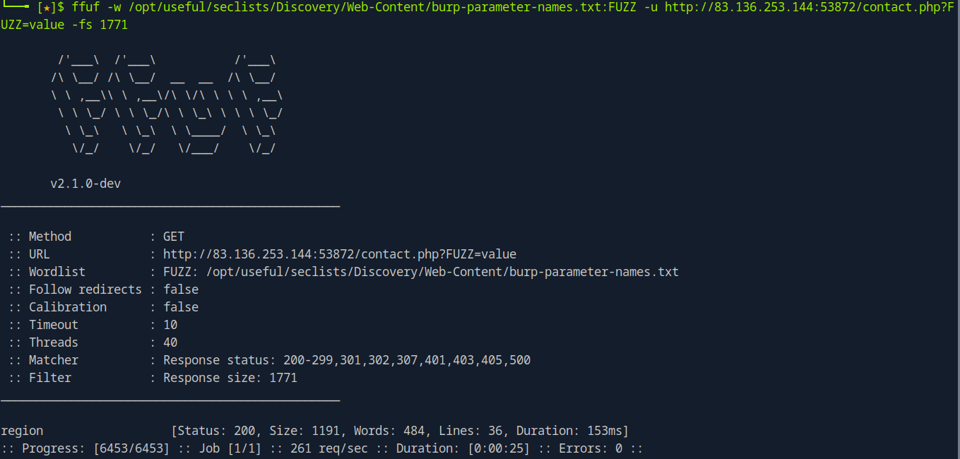 Eventually I ran FFUF on the contact page with the burp-parameter-names wordlist, which found a parameter for the page! The region parameter exists, and will hopefully be vulnerable to LFI.